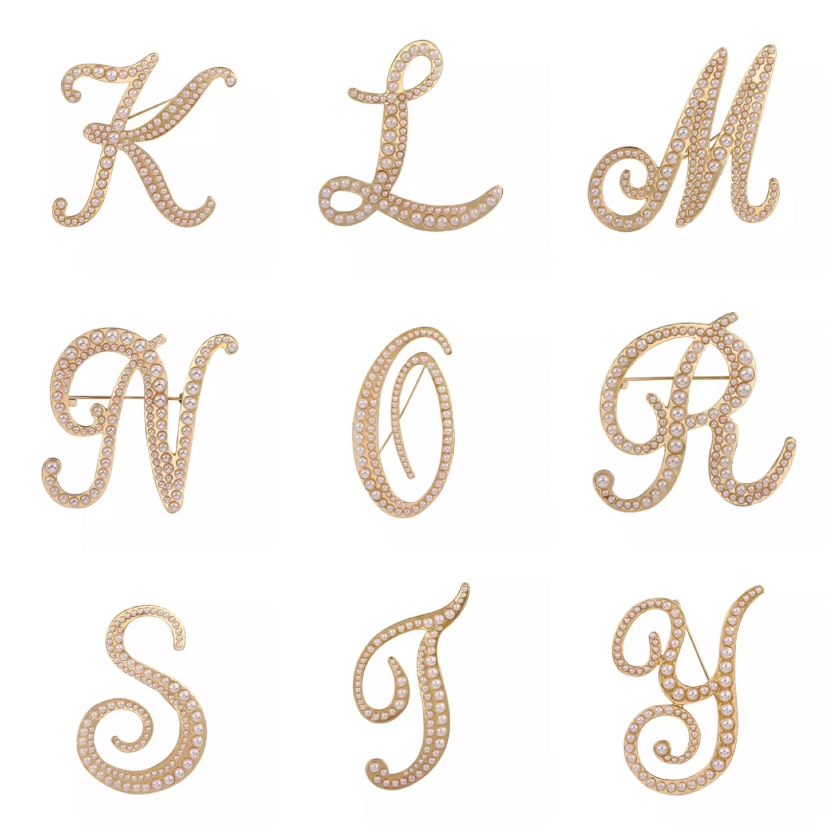 パールがほどこされた筆記体がかわいらしくもありおれしゃれなイニシャルブローチ。